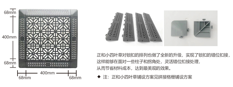 正和小四葉草采用通扣設(shè)計(jì),可以確保產(chǎn)品鋪設(shè)完成后在任何區(qū)域單獨(dú)取出,極大的方便了客戶后期局部清理泥沙等,給店面的日常衛(wèi)生維護(hù)提供了很好的基礎(chǔ)。