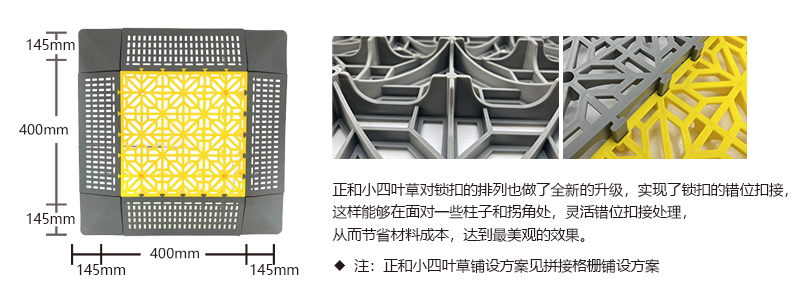 正和小四葉草采用通扣設(shè)計,可以確保產(chǎn)品鋪設(shè)完成后在任何區(qū)域單獨(dú)取出,極大的方便了客戶后期局部清理泥沙等,給店面的日常衛(wèi)生維護(hù)提供了很好的基礎(chǔ)。