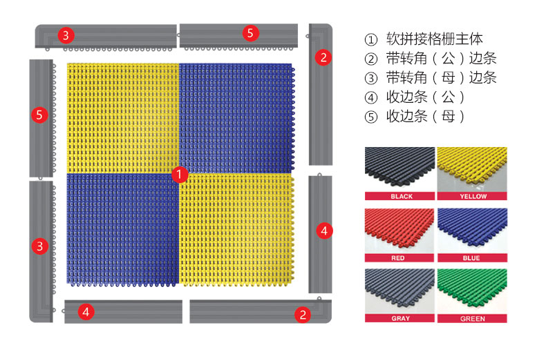 正和軟拼接格柵整體為正方形結(jié)構(gòu),采用矩陣式密集鎖扣連接,扣接牢固,施工簡單,多種色彩可供搭配,鋪設(shè)之后整齊美觀。產(chǎn)品整體采用軟性材料,讓清掃衛(wèi)生變得更加簡單,只要將整體地面卷起即可清理下方地面,高效便捷。