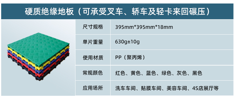 針對汽車快修車間、美容養(yǎng)護車間、汽車維修廠等區(qū)域,正和硬質(zhì)絕緣地板成為地面升級的全新選擇。正和硬質(zhì)絕緣地板下方密布數(shù)百個支撐點,完全可以承受車輛的來回碾壓,具有安裝快速簡便、對基礎(chǔ)要求寬泛、容易清理等特點 ,特別適用于車庫地面鋪設(shè)使用,也可作為產(chǎn)品展示的臨時展臺使用。 正和硬質(zhì)絕緣地板采用100%純新PP材料生產(chǎn)而成,無毒、無味、環(huán)保,可回收利用,也可以用于健身房、辦公室等商用領(lǐng)域地面使用。