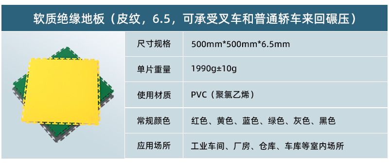 軟質(zhì)絕緣地板能將每個(gè)獨(dú)立的地板快速拼裝成整體地面,專利型鎖扣結(jié)構(gòu)連接能力更強(qiáng),可承受叉車的來回碾壓。施工過程中無需膠黏劑等材質(zhì),具有施工簡單快速、色彩絢麗、美觀大方、可移動(dòng)性強(qiáng)、可重復(fù)使用等特點(diǎn)。