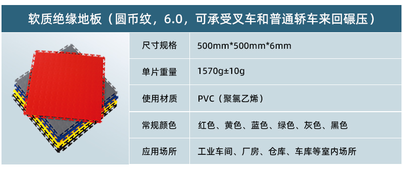軟質(zhì)絕緣地板采用純新軟性PVC(聚氯乙烯)生產(chǎn)而成,具有防滑、防油、靜音、抗沖擊、高承載等特點,可以快捷安裝在任何現(xiàn)有的基板,包括木材,混凝土,環(huán)氧樹脂,瓷磚,水磨石等,廣泛應用于車間廠房地面、倉庫地面、車庫地面、健身房、展廳等場所。