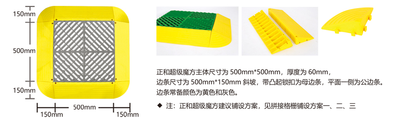 超級魔方產(chǎn)品綜合了以前產(chǎn)品的所有優(yōu)點,包括結(jié)構(gòu)設(shè)計、防滑紋路、尺寸間距、加大鎖扣、矩陣支撐等,將產(chǎn)品厚度提升到60毫米的超高厚度,真正的實現(xiàn)了汽車店鋪的免挖溝鋪設(shè)。