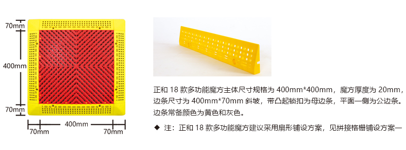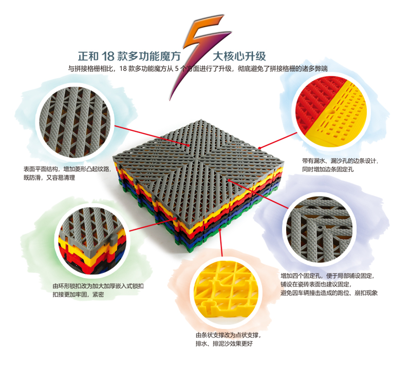 正和18款多功能魔方與拼接格柵十分類似,實(shí)質(zhì)上是對拼接格柵的本質(zhì)升級,具體區(qū)別如下: 1、拼接格柵為弧形面,而多功能魔方為平面,更容易清理衛(wèi)生; 2、拼接格柵沒有防滑處理,而多功能魔方表面增加防滑紋設(shè)計(jì); 3、拼接格柵為環(huán)形鎖扣設(shè)計(jì),扣合力小,而多功能魔方采用大鎖扣設(shè)計(jì),扣合更牢固; 4、拼接格柵下方支撐為條形支撐,多功能魔方采用點(diǎn)狀支撐,排水、排泥沙效果更好; 5、拼接格柵局部鋪設(shè)容易滑動,多功能魔方增加固定孔,局部鋪設(shè)可固定,更牢固; 6、拼接格柵邊條為實(shí)心密封邊條,而多功能魔方為帶孔漏水邊條。 正和18款多功能魔方與拼接格柵相比唯一的不足是:由于是點(diǎn)狀支撐,不能直接鋪設(shè)到玻璃鋼格柵上面。